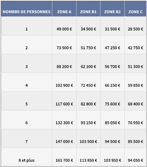 Un plafond est fixé selon le croisement de 2 critères : le nombre de personnes occupant le logement et sa localisation géographique, comme l’indique le tableau ci-dessous.